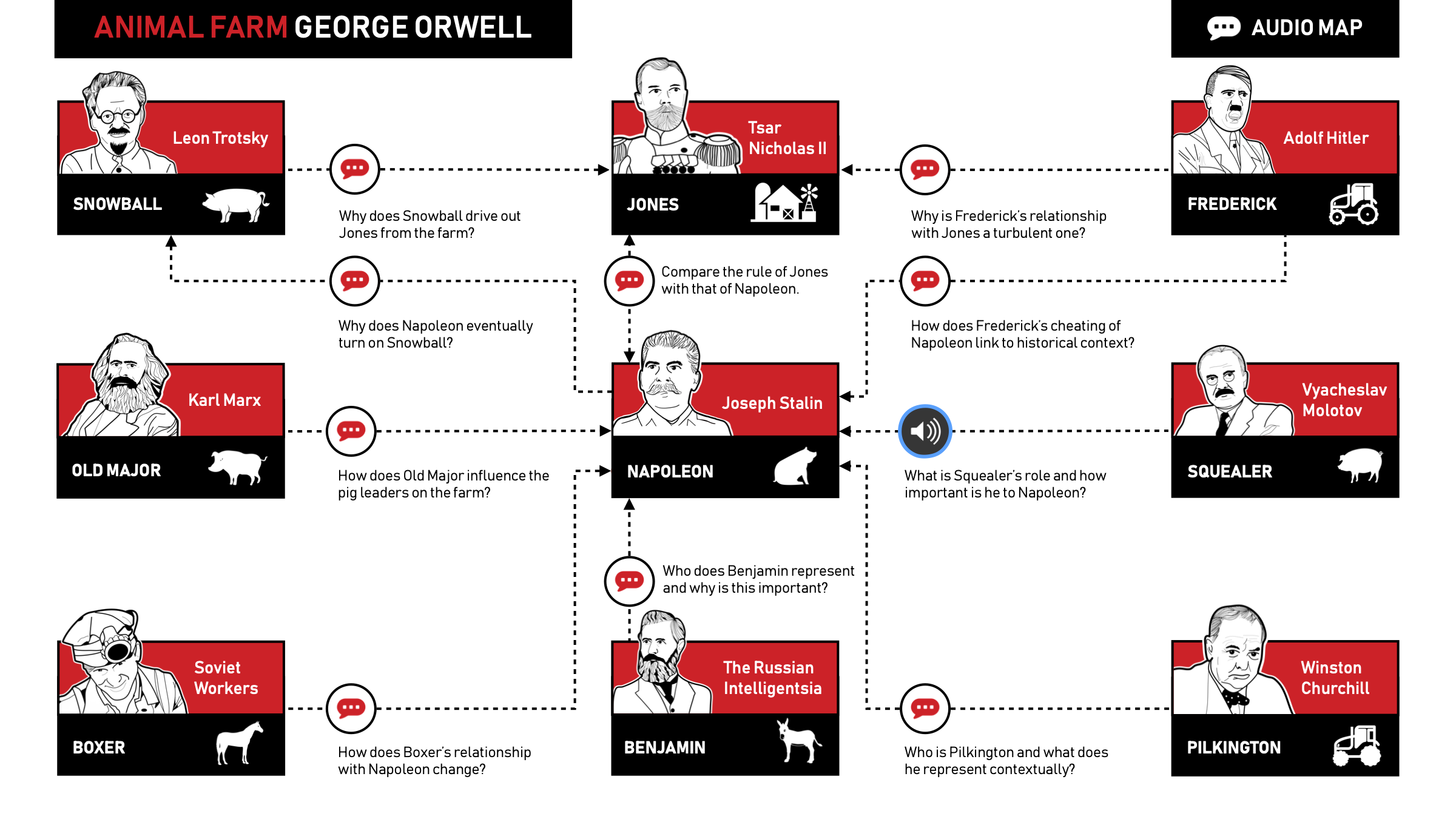 I designed the map using Apple’s Keynote software so that students could easily capture and insert short audio recordings within the app (Microsoft PowerPoint and the Mote application for Google Slides do a similar job). Adapting the conventional concept map approach, I replaced connecting verbs with big questions such as, ‘How does Boxer’s relationship with Napoleon change [throughout the text]?’. To establish my expectations, I recorded a short example to model the type of vocabulary and form of expression required for success.