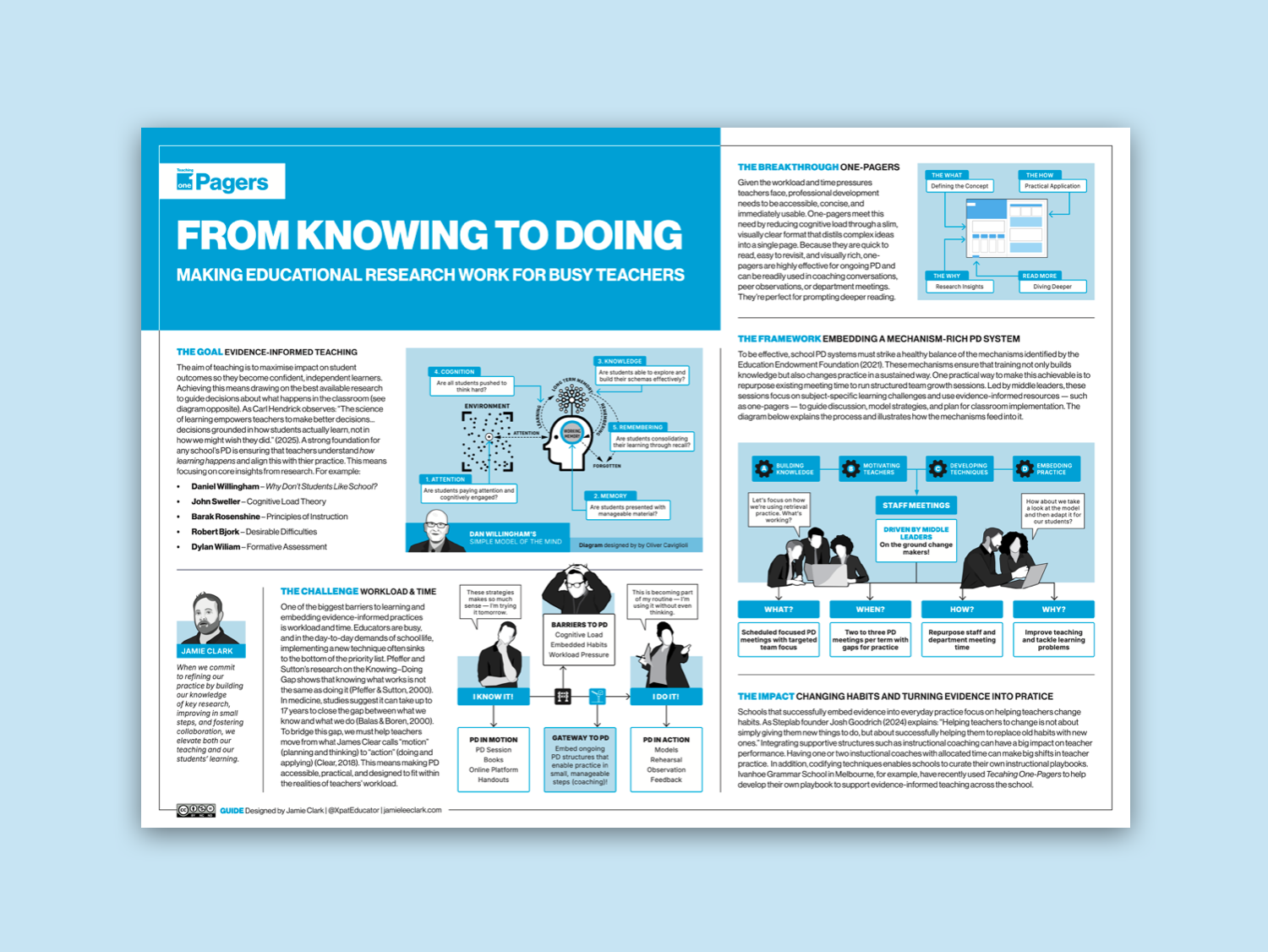 Thanks for joining the From Knowing to Doing session! As part of your exclusive resource pack, this high-quality A4 One-Pager highlights the most common challenges teachers face in PD—and offers practical, evidence-informed opportunities to overcome them.
